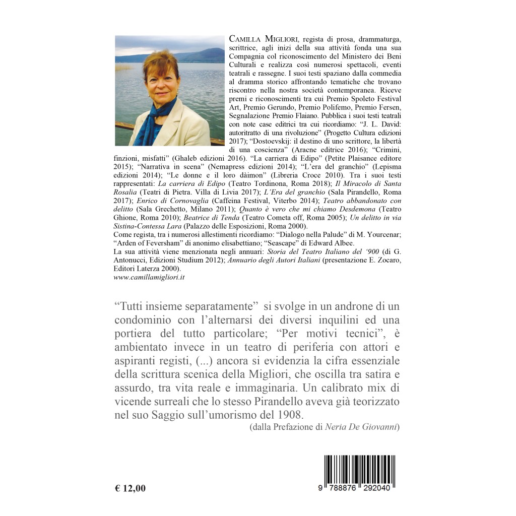 "Tutti insieme separatamente" si svolge in un androne di un condominio con l'alternarsi dei diversi inquilini ed una portiera del tutto particolare; "Per motivi tecnici", Premio Targa C. Poggiani - Siad 2009, è ambientato invece in un teatro di periferia con attori e aspiranti registi, (...) ancora si evidenzia la cifra essenziale della scrittura scenica della Migliori, che oscilla tra satira e assurdo, tra vita reale ed immaginaria. Un calibrato mix di vicende surreali che lo stesso Pirandello aveva già teorizzato nel suo Saggio sull'umorismo del 1908. (pezzo estrapolato dalla prefazione a firma di Neria De Giovanni)