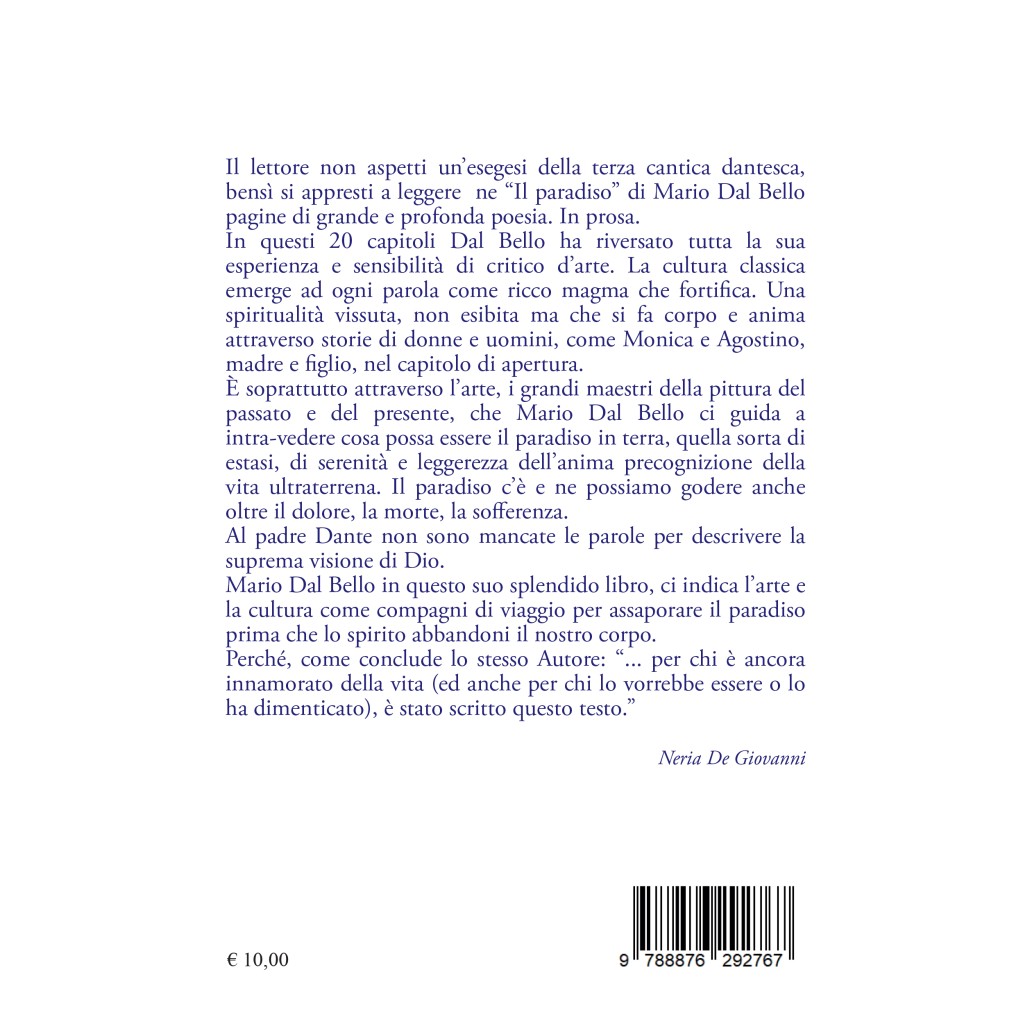 Il lettore non aspetti un'esegesi della terza cantica dantesca. bensì si appresti a leggere ne "Il paradiso" di Mario Dal Bello pagine di grande e profonda poesia. ln prosa. ln questi 20 capitoli Dal Bello ha riversato tutta la sua esperienza e sensibilità di critico d'arte. La cultura classica emerge ad ogni parola come ricco magma che fortifica. Una spiritualità vissuta, non esibita ma che si fa corpo e anima attraverso storie di donne e uomini. come Monica e Agostino, madre e figlio, nel capitolo di apertura. E soprattutto attraverso l'arte, i grandi maestri della pittura del passato e del presente, che Mario Dal Bello ci guida a intra-vedere cosa possa essere il paradiso in terra, quella sorta di estasi, di serenità e leggerezza dell'anima precognizione della vita ultraterrena. Il paradiso c'è e ne possiamo godere anche oltre il dolore, la morte, la sofferenza. Al padre Dante non sono mancate le parole per descrivere la suprema visione di Dio. Mario Dal Bello in questo suo splendido libro, ci indica l'arte e la cultura come compagni di viaggio per assaporare il paradiso prima che lo spirito abbandoni il nostro corpo.